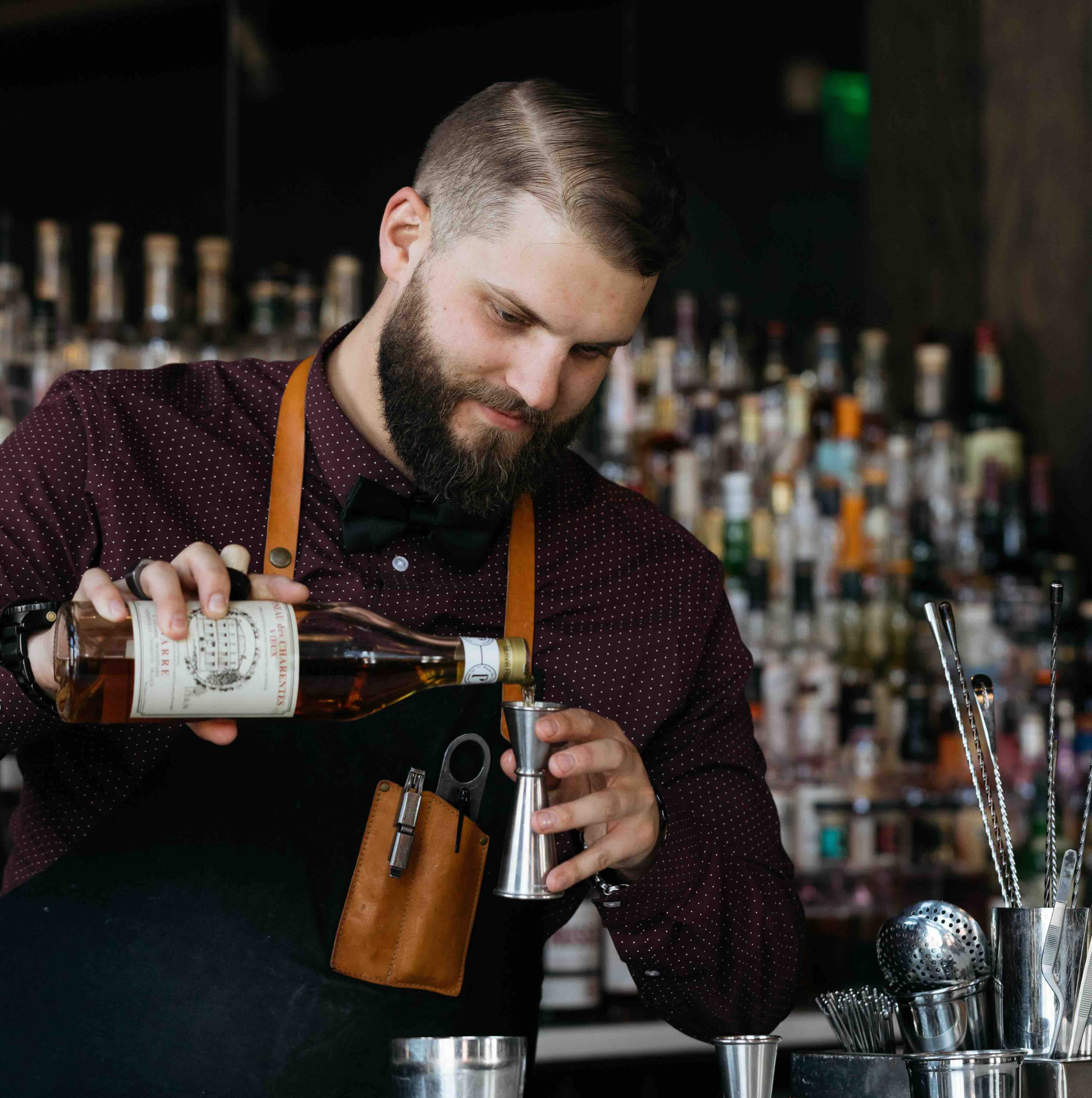 4. Pick up the bottle with your right hand, holding it around the middle of its neck. Slowly pour the liquid into the jigger, keeping the mouth of the bottle as close to the rim of the jigger as possible without bumping it. Aim to fill the jigger to the brim—no more, no less. A flat surface (the meniscus) means you’ve nailed it.